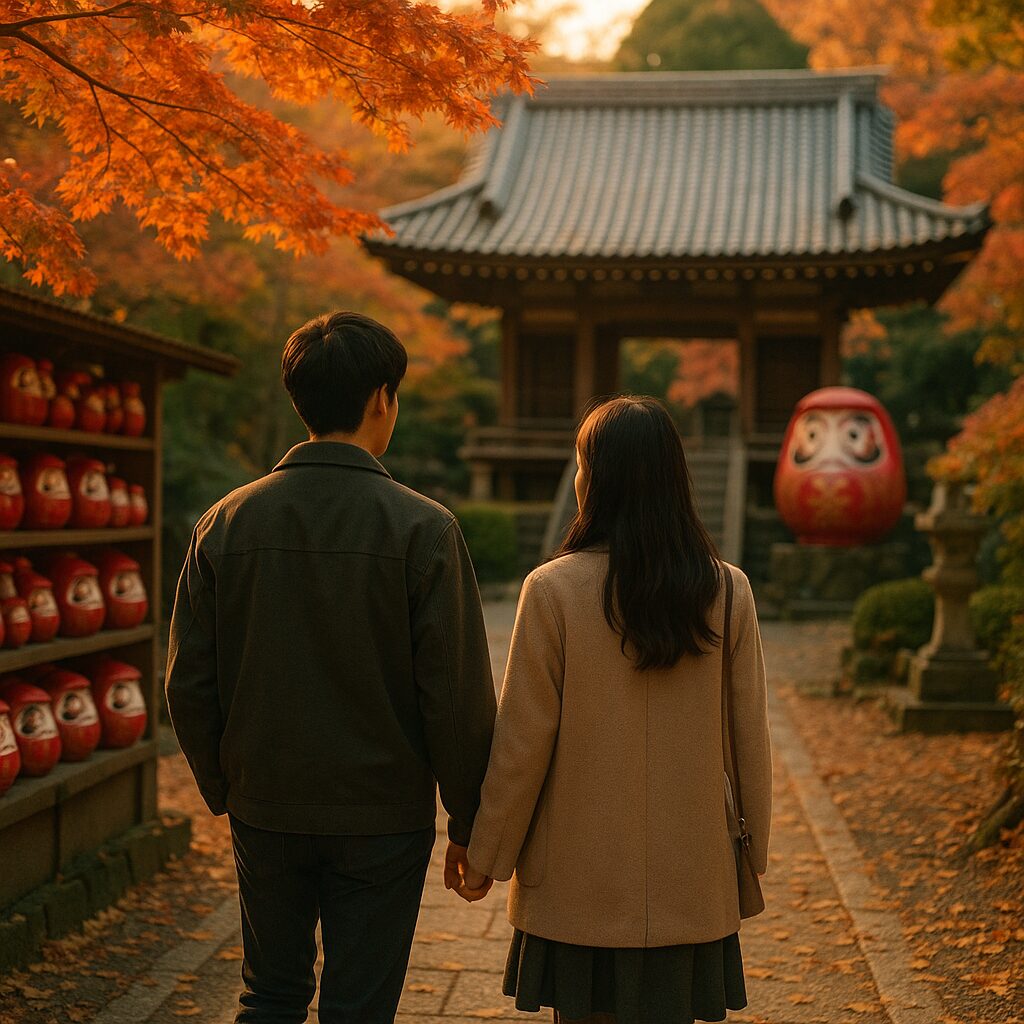 境内に着くと、空気が少し冷たくて気持ち良かった。石段を登りながら、いつもより彼女との距離が近かった気がする。無言でも気まずくない関係って、なんだか特別だ。朱色のだるまがずらりと並ぶ売店を眺めながら、ふたりで「どの表情が好き?」なんて会話をした。